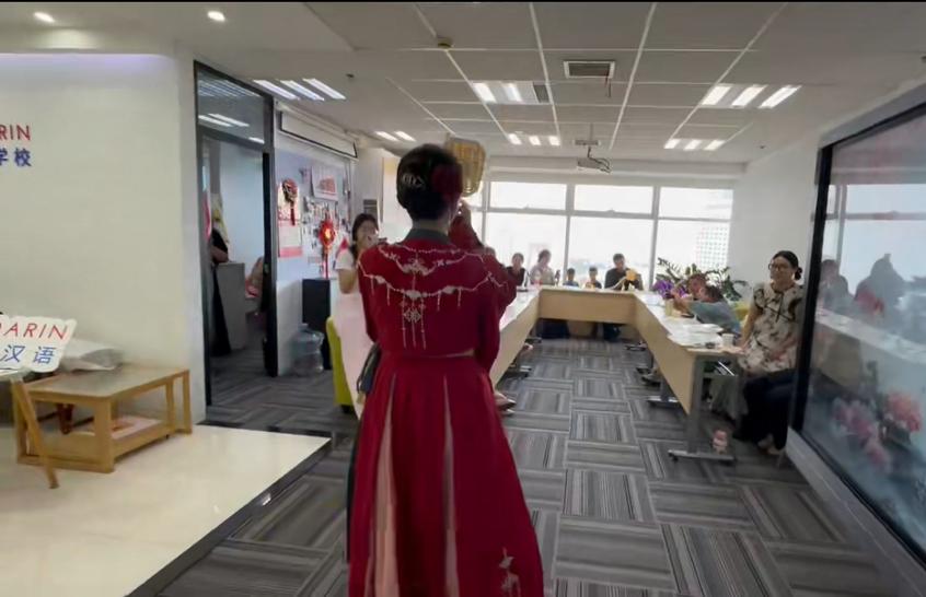 薪火相传扬国粹 智汇东西谱新章 活动最后,为进一步展现中华文化的韵味与风采,实践队队员身着汉服,手拿竹编扇,为外国学员们表演了一支古典舞。队员身姿轻盈,舞步规范,手中的竹编扇随舞姿有节奏地摇曳,将兵家文化的智慧与竹编技艺的精妙融合呈现,构成一幅生动的文化画面。这不仅是对竹编文化和兵家文化的生动展示与传承,也是对中华文化创新与发展的有力诠释。