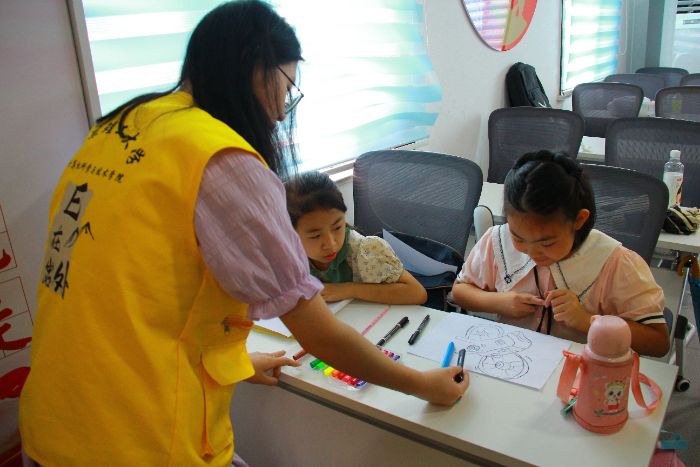 作为引导者和陪伴者,“E在岩外”的哥哥姐姐们蹲在孩子身边,轻声细语地启发他们的思路。“如果你能发明一个帮助人类的东西,它会长什么样?”“未来的学校会用什么高科技来上课?”这些开放式的问题让孩子们思维更加活跃,画笔也更加自信流畅。活动现场,孩子们的讨论声、欢笑声与画笔的沙沙声交织,气氛温馨而热烈。