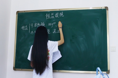课堂教学伊始,实践团成员于萌萌以 “食盐的来源” 为切入点,引导学生深入探究粗盐与精盐的本质差异。她通过专业的解析,系统阐释了粗盐的混合物属性:指出其主要成分氯化钠才是日常食用的精盐,同时其中还含有泥沙等不溶性杂质,以及氯化镁、氯化钙等可溶性杂质。基于此理论分析,进一步引导学生开展关于杂质分离方法的思考与探讨。