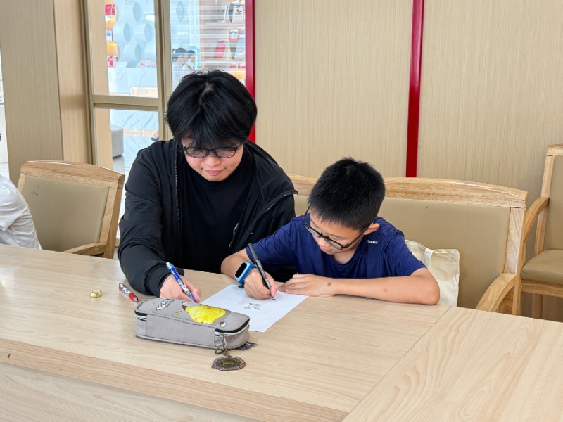 创意绘画环节充满想象色彩。穿碎花裙的小女孩在画纸中央画书房,却在屋顶画了朵巨大的向日葵,花瓣用明黄和橙红渐变:“这样书房里就一直有阳光。” 旁边的男孩将书房画成宇宙飞船,书架变成火箭喷射器,书本化作星星:“我的书房能飞到外太空,和外星人分享故事。” 穿蓝色 T 恤的小男孩画完书房主体后,在角落添了几个读书的小人:有戴老花镜的爷爷,有抱玩偶的小女孩,还有托腮思考的少年。他的画作吸引了其他孩子,大家七嘴八舌提议添加元素,画纸上渐渐布满彩虹、会说话的书本和飞翔的书签。