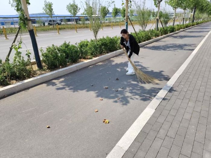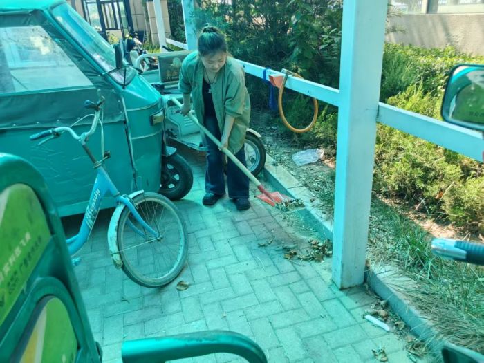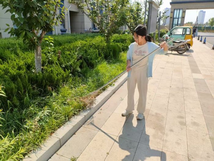 在清理杂草区域,实践团成员们挥动着锄头,将一丛丛杂草连根铲除,随后用扫帚将割下的杂草清扫归堆,再装入编织袋中搬运至指定地点。日常的扫地和倒垃圾工作,实践团成员们也从未懈怠。每天定时对小区内的垃圾进行清扫和清运,确保垃圾日产日清,维护小区的环境卫生。