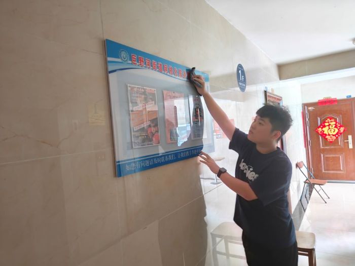 花坛及树池周边的杂草整治工作中,成员使用锄头根除蔓延植被,规范绿植生长空间,避免杂草侵占居民休闲区域。社区宣传栏的玻璃面板及金属框架经全面清洁。成员清除胶痕与积尘,保障政务通知清晰展示,提升社区信息传播效率。