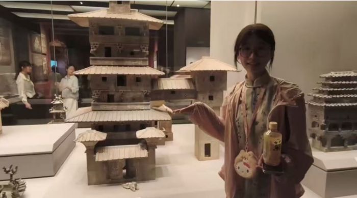 图为团队成员毛敏娜讲解七层连阁彩绘陶楼。通讯员 杨梦炫 摄