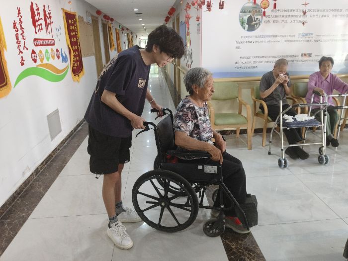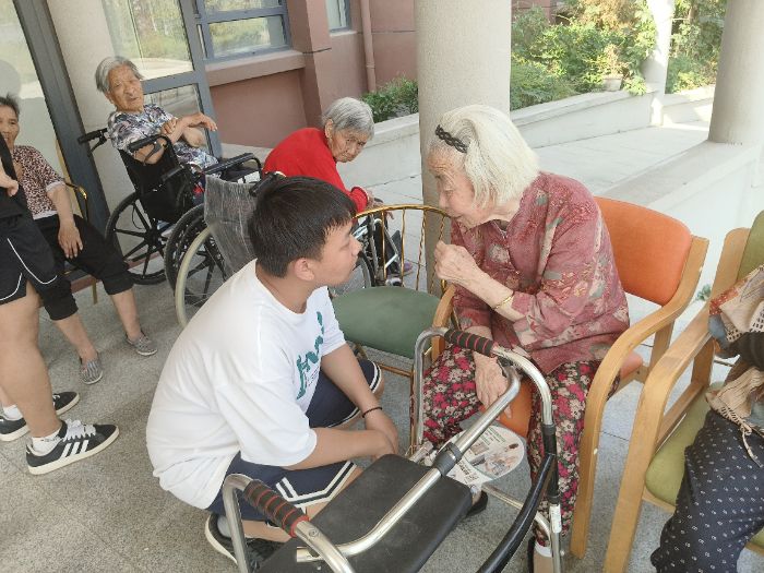 胡卓凡会细心地推着行动不便的老人到户外乘凉,让老人们尽情享受夏日的微风与阳光。刘鑫具备相关医疗知识。他充分发挥自身优势,为老人们测量血压,耐心地向老人们讲解健康知识以及日常保健的要点,切实关注老人们的身体健康状况。