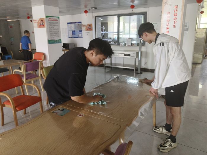 图为实践团成员原浩(左)与满嘉成(右)擦拭餐厅桌面
