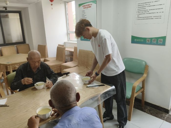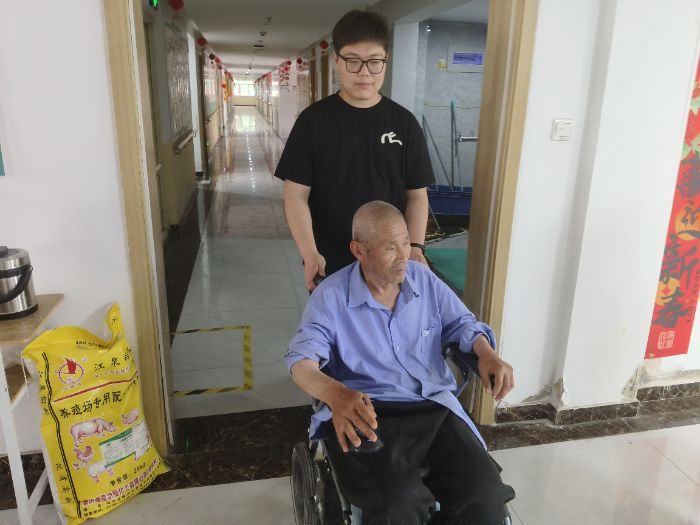在天气晴好的傍晚,魏栩博细心推着行动不便的老人至院内阴凉处,陪伴他们聊天,欣赏庭院景致,感受自然气息。王学军陪伴老人进行棋类对弈。在棋盘方寸之间,他们耐心引导、专注交流,为老人的日常休闲时光增添了互动乐趣。