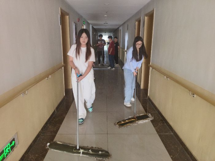 冷娇主动承担起楼道清扫工作。他仔细擦拭扶手、清洁地面,确保养老院公共空间的卫生整洁,为老人日常行走安全提供保障。高楠楠对养老院内的图书阅览室进行了系统整理。他们按类别重新归置图书,清洁书架灰尘,使图书馆面貌焕然一新,为老人创造了更愉悦的阅读体验。