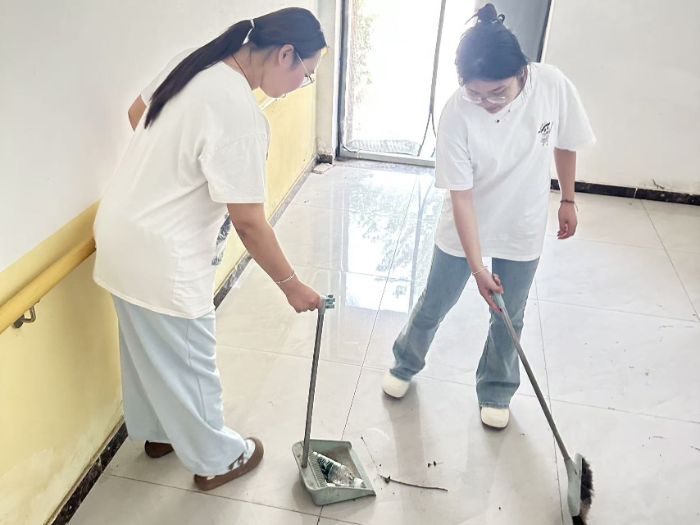 刘薇琪和周甜甜投身于环境卫生清洁工作。他们手持扫帚、拖把等清洁工具,认真清扫每一处角落,不放过任何卫生死角。从地面的灰尘到窗台的污渍,经过他们的细致清理,整个活动区域焕然一新,为老人们营造出整洁舒适的居住环境。