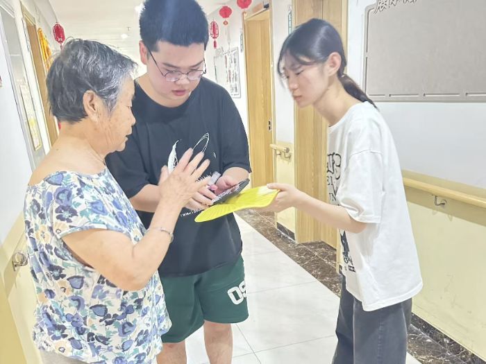 除了日常护理协助,裘思男陪伴老人聊天解闷。他们围坐在老人身旁,耐心倾听老人讲述过去的经历与故事,分享生活中的点滴趣事。老人们的脸上洋溢着笑容,眼神中透露出温暖与欣慰,这场心灵交流为老人们带来了欢声笑语,也温暖了他们的心窝。