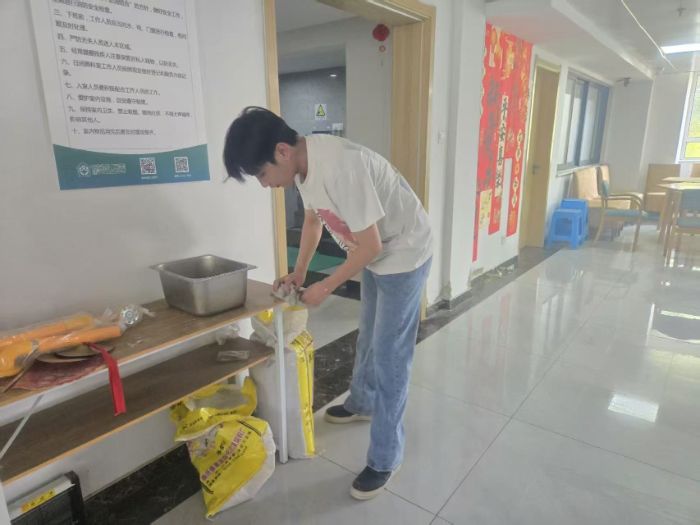 赵嘉宝和杨皓然在室内为老人接热水、擦桌子。及时为老人的水杯续上热水,确保老人们随时有热水饮用;同时,仔细擦拭桌子,保持桌面的干净整洁,方便老人用餐和活动。这些看似微不足道的小事,却体现了成员们对老人的细心照顾和贴心关怀。