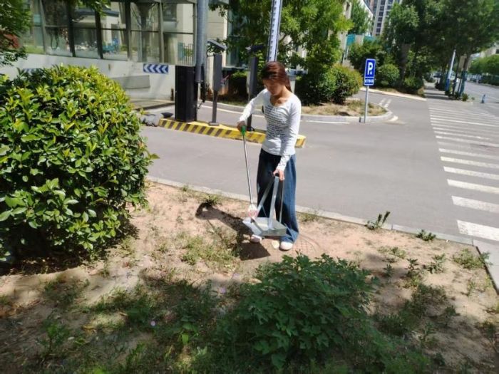 绿化带散落的塑料包装、烟蒂等杂物由成员分组处理。通过夹钳工具进行地毯式排查,分类收集垃圾并转运至指定回收点,显著改善绿化区域卫生状况。