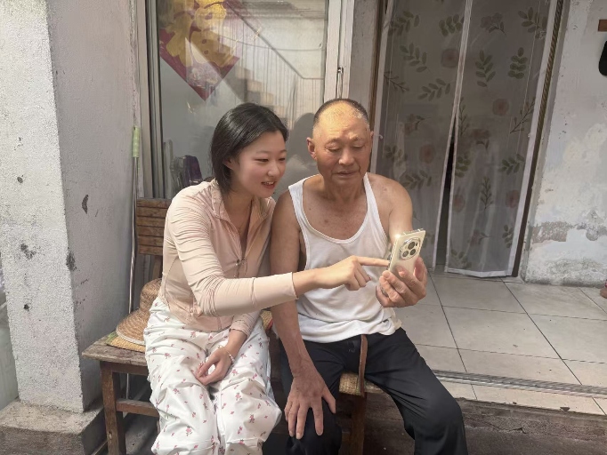 实践团成员拜访当地老人,教老年人使用智能手机。并给老年人观看反诈视频,讲述真实案例,包括保健品诈骗、虚假投资等,以防老年人在互联网上信息泄露,防止诈骗。