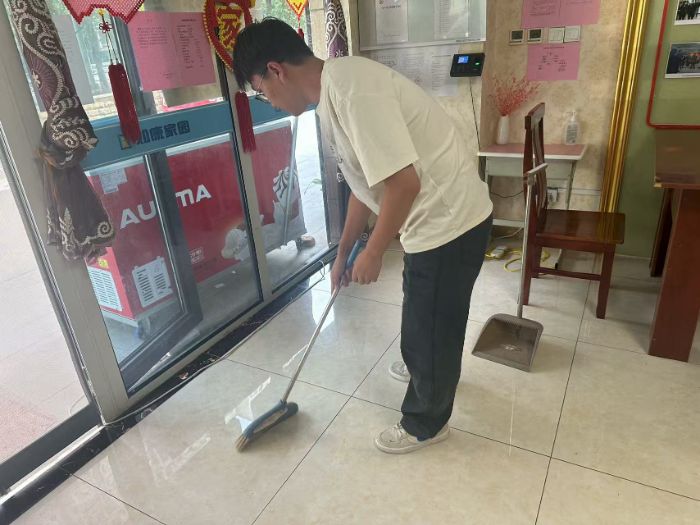 实践团成员走进“如康家园”,助力残障人士营造洁净空间,成员手持扫帚,专注清洁地面,从角落灰尘到零散杂物,细节清理每一处。这不仅是一次卫生清扫,更是用行动传递关怀。让残障朋友在整洁环境中感受社会温暖。