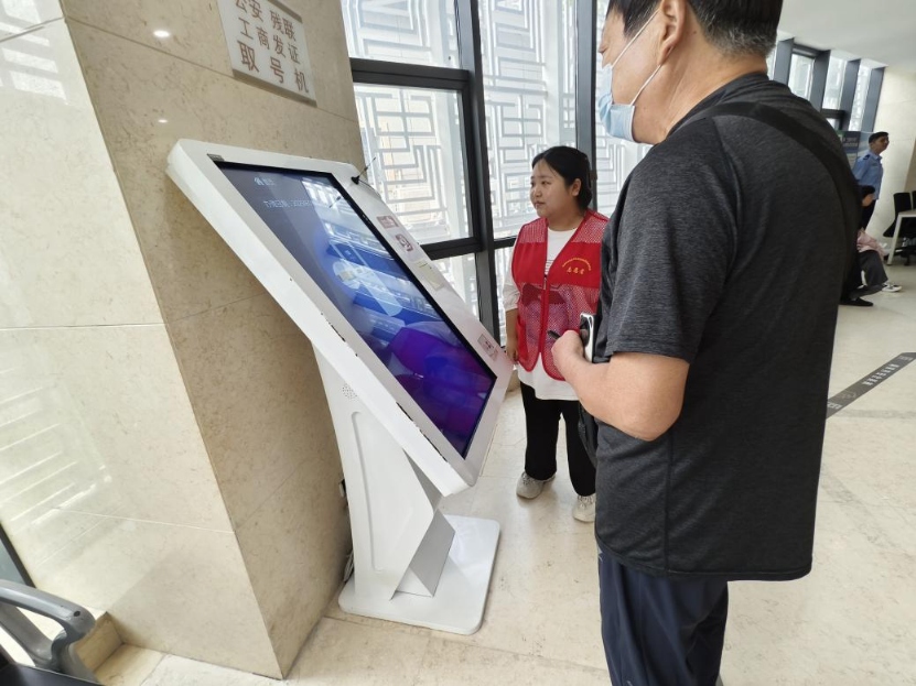 身着红色马甲的实践团成员专注协助群众操作取号机。在取号机旁,志愿者细致解答业务咨询,帮群众规划办事路径,引导前往对应窗口,助力办事效率提升,一边清晰讲解触控选择、信息确认等流程,一边留意群众操作反馈,手把手教群众完成取号,助力其高效开启办事环节。