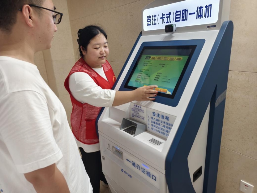 在政务服务大厅,身着红色马甲的实践团成员,迅速融入服务角色。面对签注(卡式)自助一体机遇到不会的群众,耐心指导群众操作,清晰讲解签注流程,确保群众能够顺利完成签注。