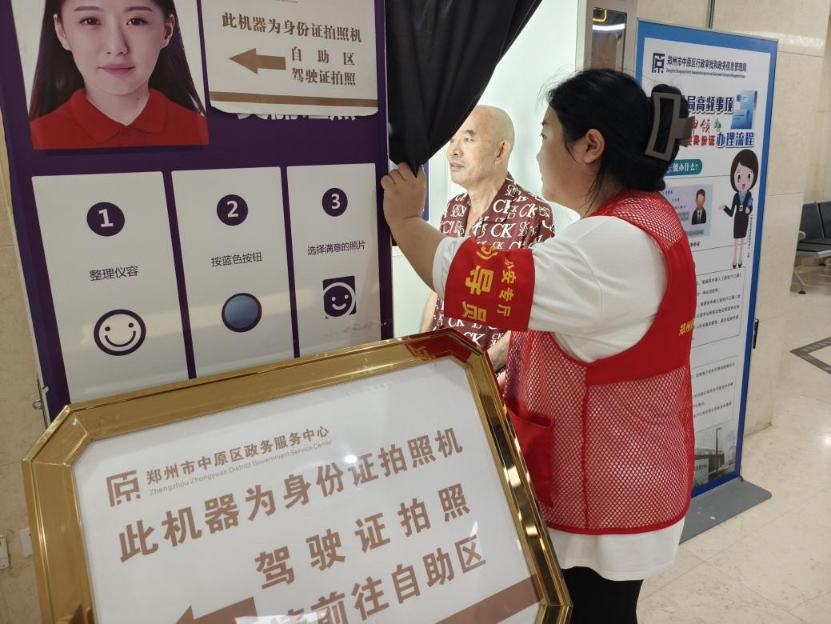 身着红色马甲的实践团成员协助群众使用身份证拍照机,引导群众入座调整,对照拍照流程牌,逐项提醒群众整理仪容、按压按钮、选取照片等操作要点,用细致入微的协助,让群众办事更顺畅,助力群众高效完成拍照环节,提高群众办事效率,省时高效地协助群众完成身份证的业务办理。