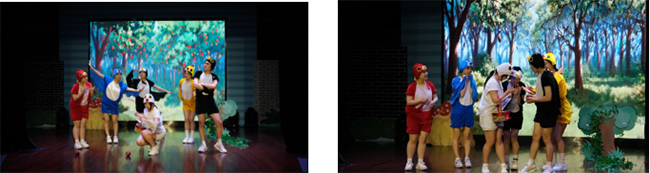 1.专业演绎模块 团队匠心独具,对传统民间故事进行现代化改编,巧妙运用声光影多媒体技术,营造出引人入胜的沉浸式舞台氛围。在忠实保留“百鸟和鸣”等经典情节精髓的同时,创新性地融入现代儿童教育理念。通过富有童趣的拟人化角色设计,将“仁爱”、“诚信”、“礼让”等传统美德,具象化呈现为舞台上鲜活灵动的艺术形象。演员们以夸张而富有张力的肢体语言、饱含情感的台词演绎,将抽象的德性教化转化为可感可触的舞台叙事。例如,在“百鸟赠羽”这一动人场景中,精心设计的戏剧冲突生动诠释了团结互助的价值,让儿童在愉悦的审美体验中,自然而然地领悟到传统文化的深邃内涵。