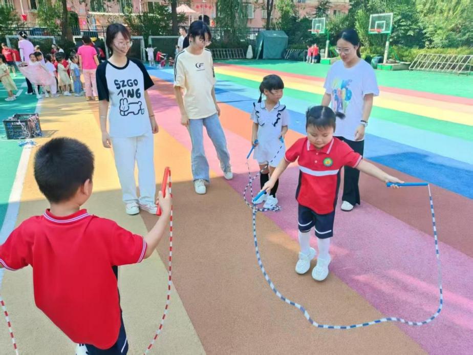户外时光同样活力满满。志愿者们穿梭于操场教室,协助整理活动工具,将五颜六色的铲子、水桶分类归位,为孩子营造整洁游戏环境。跳绳活动中,他们化身 “运动伙伴”,陪孩子练习、计数,当看到孩子们从笨拙跳绳到轻盈跃起,脸上溢出的成就感,成为夏日最动人的风景。