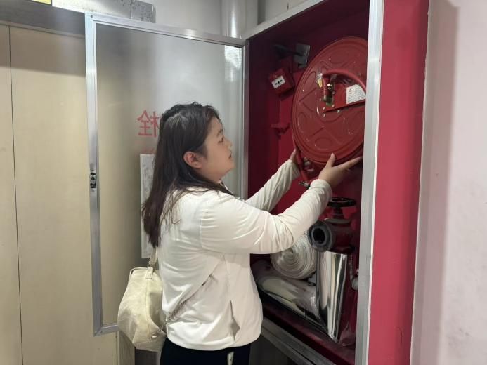 图为实践团成员李颜检查消防设备