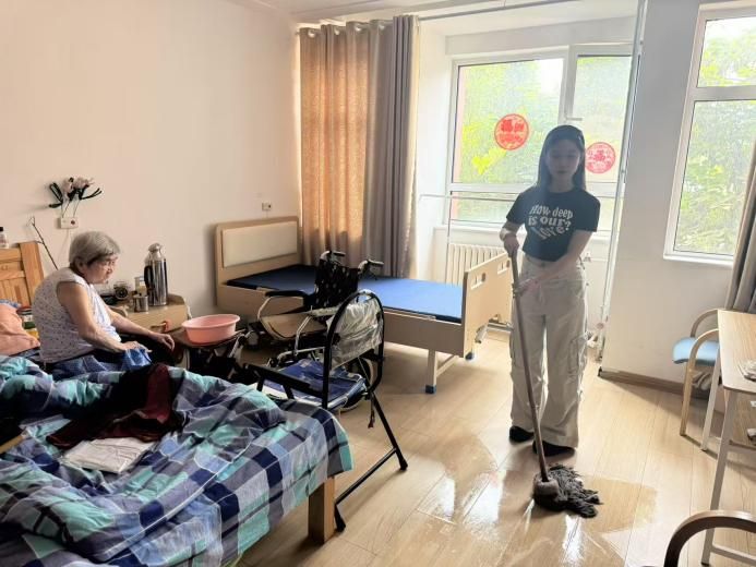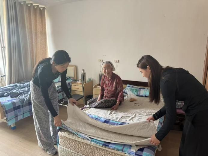 整理床铺是一项细致的工作。张馨方与刘子萌将老人们床铺收拾平整,被子拿去晾晒,让老人们住的更加舒适安心。