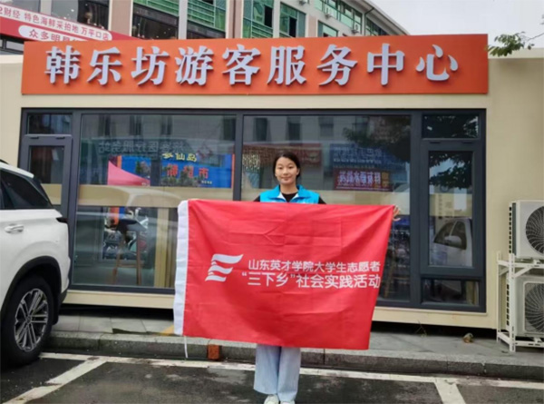 活动期间,志愿者身着蓝色志愿马甲,积极投身到社区的服务之中。在韩乐坊游客服务中心,志愿者举起印有“山东英才学院大学生志愿者‘三下乡’社会实践活动”字样的红色旗帜,标志着此次活动正式展开。她的身影成为社区街头一道亮丽的风景,展现了青年大学生的责任与担当。