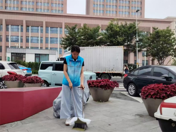 在日常服务中,志愿者主动承担社区环境维护的工作。她拿起扫帚与簸箕,清理道路上的落叶与垃圾,使社区环境更加整洁有序。虽是炎炎夏日,但她始终保持专注与耐心,确保每一个角落都焕然一新。居民们路过时,纷纷投来赞许的目光,社区环境也因她的努力而更加宜居。