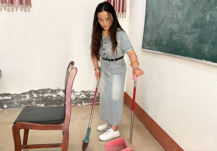 图为实践团成员打扫卫生