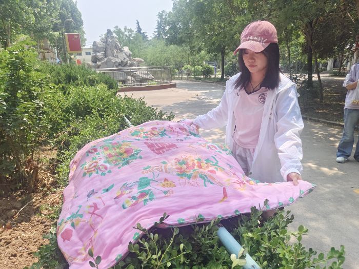 图为实践团成员陈路遥为老人晒被子