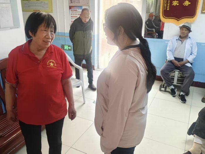 王聆毓和朱雅慧把原本堆积的杂物被清理干净,地面变得整洁,花坛和绿化区域也更加美观。在健康服务方面,顾启悦为老人测量血压,记录健康数据,并与医护人员交流老人的健康状况。