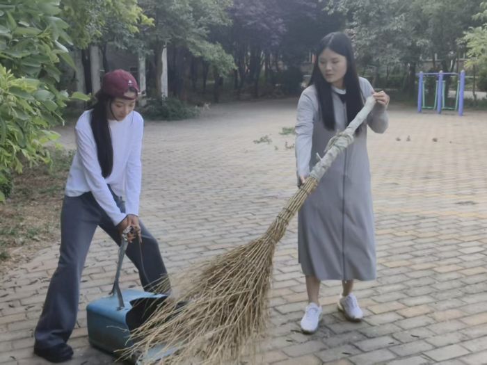 图为实践团成员王聆毓(左)与朱雅慧(右)打扫养老院院子