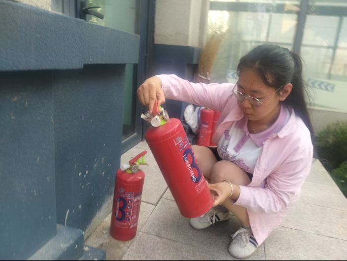 图为实践团成员检查灭火器日期