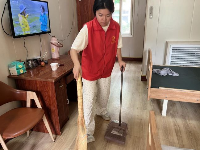 深入老人生活空间,实践团成员分组进入不同居室提供清洁服务。他们协助老人整理个人物品,有序归置常用物件,并使用抹布、扫帚等工具认真清扫地面,仔细擦拭家具表面的浮尘。经过系统打扫,老人们的个人居住环境变得更加整洁、有序,居住舒适度得到提升。