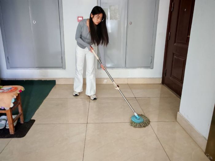 实践团成员们分工合作,有的负责打水,有的拿着拖把认真地为楼道拖地。经过他们的辛勤劳动,楼道地面变得干净整洁,居民们的出行环境得到了显著改善。