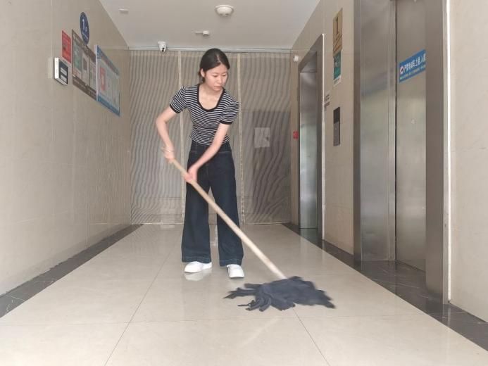 实践团成员还对居民楼的楼道进行了拖地清洁。他们分组进入各栋楼的楼梯间和走廊,使用拖把、清洁剂和水桶进行彻底清洁。工作重点包括去除污渍和灰尘,确保地面光滑无积水。成员们提升了楼道的卫生标准,减少了滑倒风险,为居民提供了更安全的通行环境。