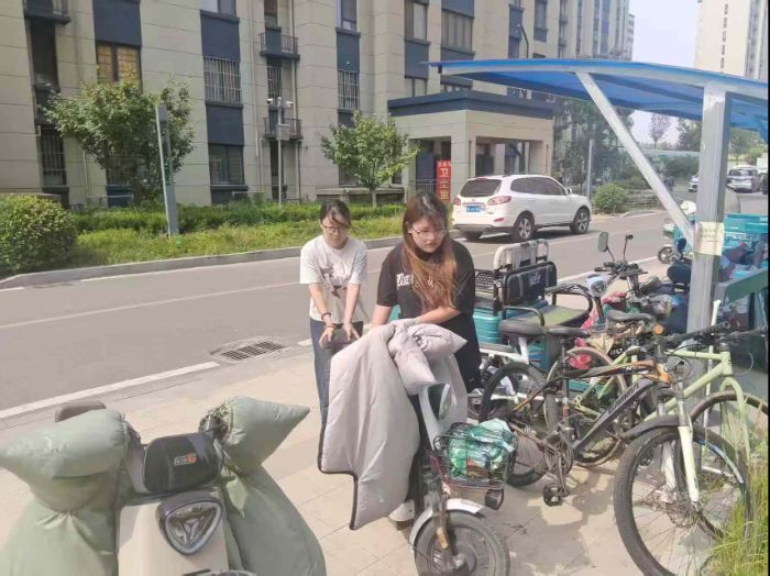 实践团成员对社区内的未按规定位置停放电动车进行规整。他们相互合作把电动车摆放整齐,让社区变得更加整洁有序,并提醒居民按照划分停车区域进行停车。