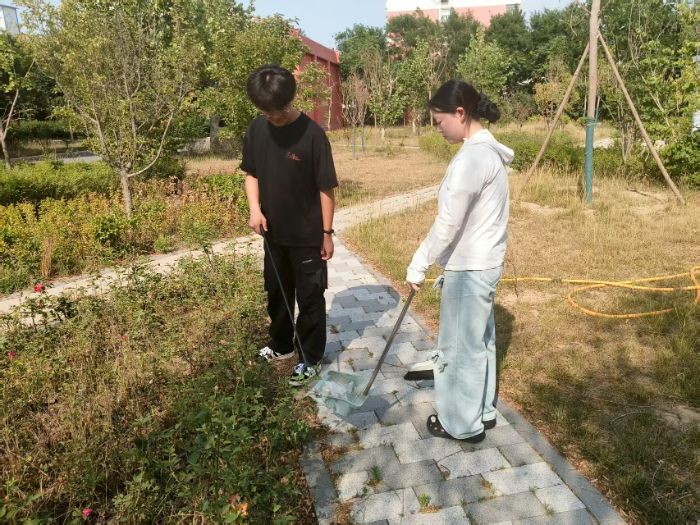花园区域,于藤爽捡拾了散落的垃圾和落叶。使用工具清理草坪和步道,将废弃物分类处理,有效美化了社区环境,提升了居民的生活品质。健康监测环节,为老人测量血压。他们使用专业设备进行定期检查,记录数据,并向老人讲解健康建议,帮助老人及时了解自身身体状况。