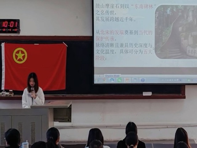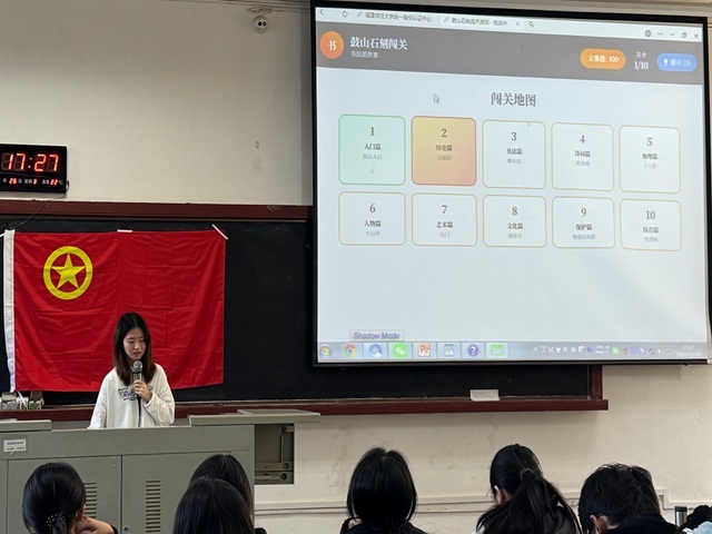 11月26日,文学院2024级汉语言文学第一团支部在仓山校区文科楼103教室开展以,“石韵文心承古意,青年刻忆续新声”为主题的理论研讨活动。活动始伊,团支书谢梓馨同学向支部成员介绍本学年团日立项活动安排并梳理鼓山石刻的源流沿革、历史背景,帮助支部成员构建对石刻文化的整体认知框架。在初步理论奠基后,支部成员一同试用利用AI技术制作的鼓山石刻问答闯关游戏,在游戏中巩固鼓山的相关知识。最后,班主任刘海燕老师进行知识总结并回答同学的疑问。本次理论研论活动加深了支部成员对鼓山石刻的历史脉络以及其所承载的文化价值的理解,并结合AI技术重新诠释鼓山石刻文化,增强了支部成员的文化自信与创作表达力。