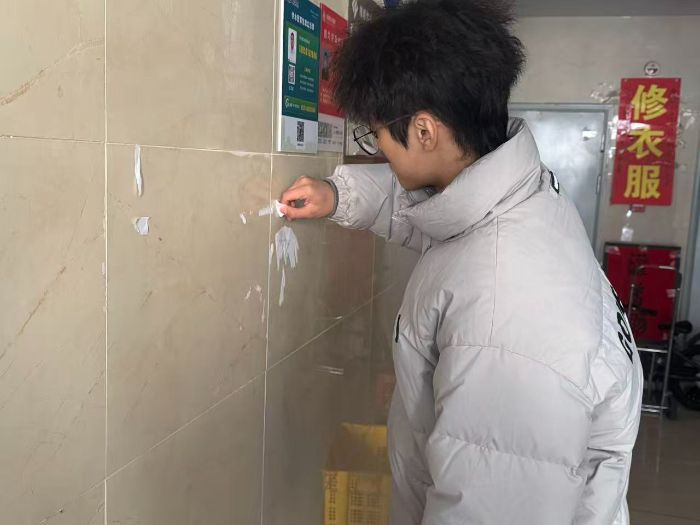 针对社区内非法张贴的小广告问题,实践团成员开展了清理整治行动。成员们使用铲刀、喷壶等工具,对楼道墙面、电线杆及公共设施表面的小广告进行了细致清除,恢复了社区环境的整洁面貌。