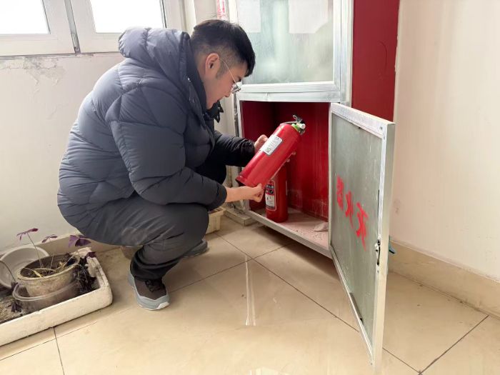 在消防安全检查环节,实践团成员逐栋逐层对楼道内配备的灭火器进行细致查验,重点核对生产日期、有效期及压力表状态,对发现的问题及时记录并反馈给社区物业,确保消防器材处于良好备用状态。