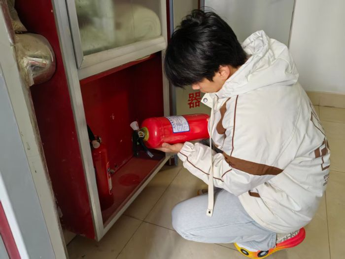 图为实践团成员检查灭火器