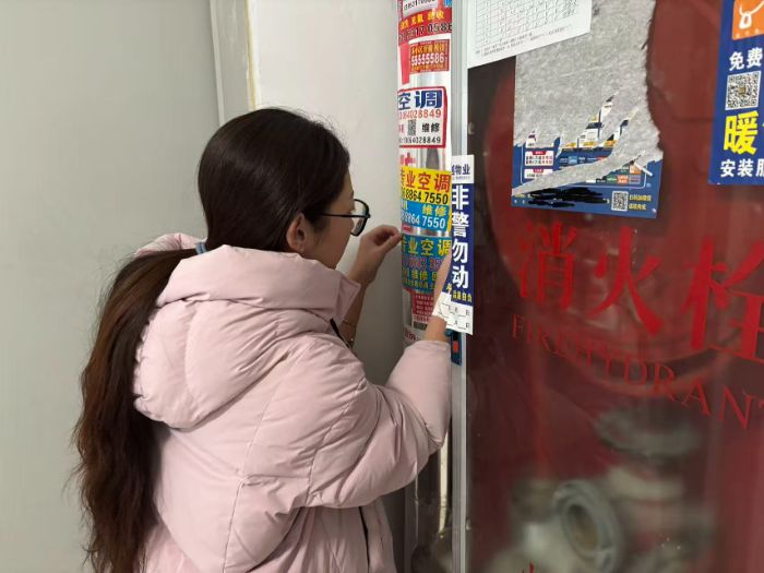 撕除小广告,净化社区环境。针对社区内楼道、墙面、电线杆等公共区域随意张贴的小广告问题,实践团成员携带铲子、喷壶等工具,对各类非法小广告进行全面清理。