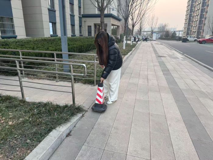 为筑牢社区通行安全防线,“禾苗”实践团成员还开展了交通反光锥桶摆放工作。他们结合小区道路走向和通行特点,在路口、拐角及易拥堵路段,有序摆放反光锥桶,引导车辆减速慢行、规范通行,有效排查了路面通行隐患,为居民出行增添了安全保障。