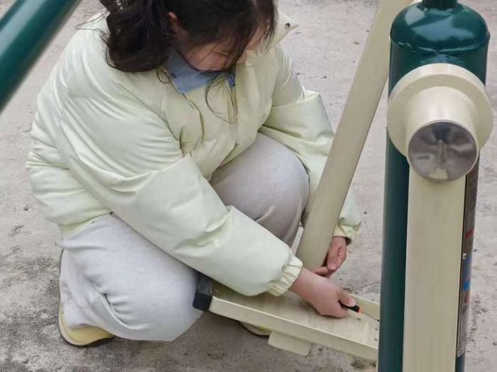 针对小区内的娱乐设施,实践团成员重点检查了健身器材、儿童游乐设施的安全状况,查看金属部件防锈处理是否到位、螺丝连接是否牢固,核查缓冲地垫厚度是否符合标准,对松动的健身器材扶手进行临时固定,及时排除简易安全隐患。