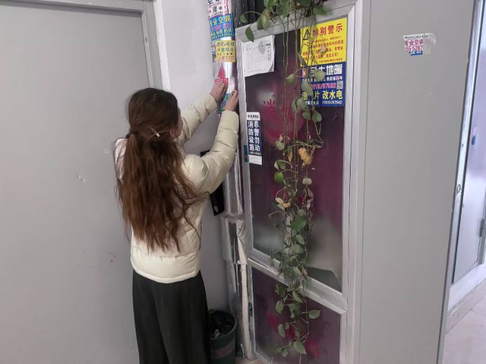 实践团首先着力于改善社区公共环境。他们对居民楼内各处随意张贴的小广告进行了彻底清理,逐一铲除楼道与单元门上的顽固贴纸,有效恢复了墙壁的整洁面貌,为居民营造了更为清爽的居住空间。