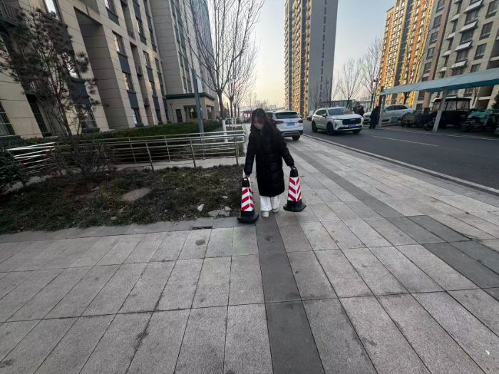 实践团在社区关键路口摆放了交通反光锥桶。这些锥桶被设置在转弯处、交叉口及车辆密集区域,以引导车辆减速慢行、规范行人通行路线。此举有助于预防交通事故,强化社区交通秩序,同时提高了居民对安全出行的重视程度。