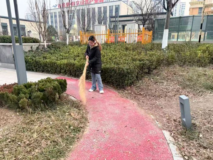 此外,实践团的成员们还对社区主要道路及广场区域进行了全面清扫。他们清扫了路面的落叶、尘土与零星杂物,维护了公共区域的洁净,改善了社区居民的居住与活动环境。