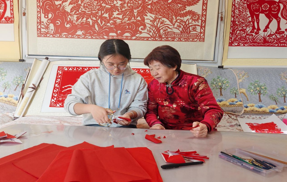 (图为在非遗传承人指导下剪纸的照片侯心语供图)