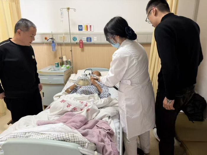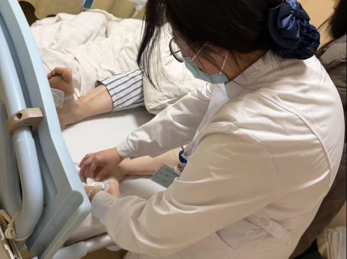针对部分需要中医特色治疗的患者,实践团成员开展了脚部艾灸服务。他们耐心定位穴位,熟练点燃艾柱,并在治疗全程密切留意患者感受与艾灸温度,用传统疗法为患者舒缓病痛。