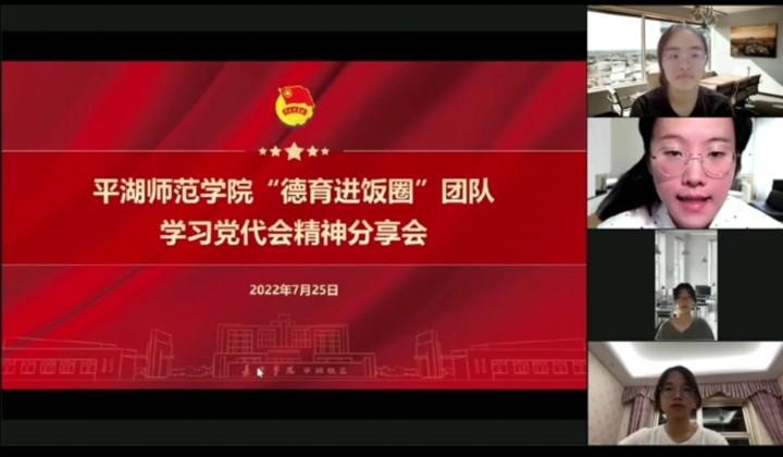 浙江省第十五次党代会隆重召开,大会总结过往成就,展望美好未来,为全省擘画发展蓝图。平湖师范学院(应用技术学院)德育进饭圈暑期社会实践团队也组织研读学习,深刻领悟了党代会精神与深远意义。为进一步深入学习省第十五次党代会精神,7月25日晚,本团队学习党代会精神分享会通过线上会议形式正式举行。德育进饭圈团队负责人冷静怡主持本次会议,团队全体成员参加了本次分享会。