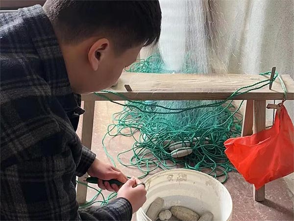 红旗村作为沿海城市,有着大量的传统技艺,实践团拜访多位老人家里,在宣传反诈骗和给他们送去年货的同时,也亲自体验了传统织网技术。大部分老人都反映年轻一辈很少去学习这些而导致他们的手艺失传。